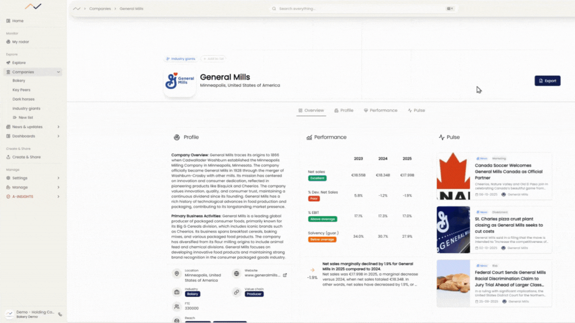 Imagine your stakeholder asks you to quickly draft a competitor profile for their end of week board update. It would take hours to get through it, sum it up and then make a nice digestible output. Now you can simply export a easy-to-read company profile and share it further. it should take about 5 seconds.